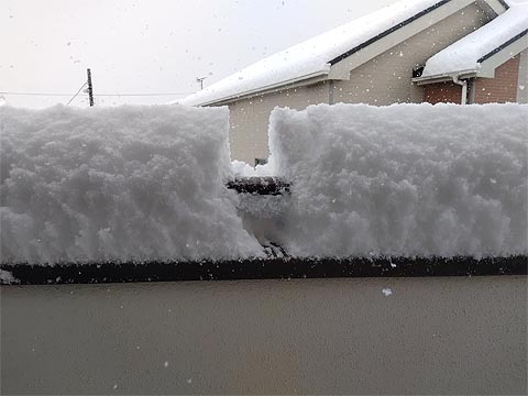 ベランダの手すりも凄い事になってて、その積雪具合が一目瞭然。